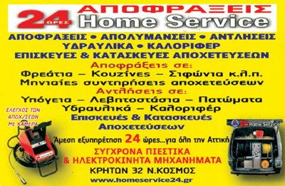 Η εταιρεία ΗΟΜΕ SERVICE 24 του ΜΙΧΑΗΛ ΔΑΝΕΖΗ δραστηριοποιείται 40 χρονια και πλέονστις ΑΠΟΦΡΑΞΕΙΣ των ΑΠΟΧΕΥΣΕΩΝ και στις ΑΠΟΛΥΜΑΝΣΕΙΣ. Είναι απο τις ελάχιστες πλέον που σας εγγυάται άμεση και σίγουρη εξυπηρέτησηόλο το 24ωρο στον Νέο Κόσμο, το Παγκράτι, τον Άγιο Δημήτριο, τη Γλυφάδα, το Μοσχάτο,τον Ταύρο, την Καλλιθέα, το κέντρο Αθήνας, το Φάληρο, τον Πειραιά, την Νέα Σμύρνη και σε όλη την Αττική.Το έμπειρο προσωπικό μας σε συνδυασμό με τα πιο σύγχρονα μηχανήματα,πιεστικά - ηλεκτροκίνητα, είναι για εμάς το απαραίτητο συστατικό, για το καλύτερο αποτέλεσμα.Αναλαμβάνουμε καθε είδος απόφραξεις αποχετεύσεων σε φρεάτια,κουζίνες, σιφώνια αποχευτετικά δίκτυα εσωτερικών αγωγών. Πραγματοποιείται απο εμάς έλεγχος των αποχετεύσεων σας με κάμεραγια σίγουρη διάγνωση του προβλήματος.Επίσης αναλαμβάνουμε αντλήσεις υδάτων καθαρών και ακαθάρτωναπό υπόγεια λεβητοστάσια και ξύλινα πατώματα, καθώς και οποιαδήποτε πρόβλημαστα υδραυλικά και τα καλοριφέρ σας.Η επισκευή και η κατασκευή αποχετεύσεων ειναι άλλη μια υπηρεσία που αναλαμβάνουμε για εσάς.Αναλαμβάνουμε μηνιαίες συντηρήσεις σε όλες τις αποχετεύσεις, απολυμάνσεις και μυοκτονίες.Απολυμάνσεις παλιές μονοκατοικιών, υπογείων, πολυκατοικιών και επαγγελματικών χώρων,υγειονομικού ενδιαφέροντος για εξουδετέρωση όλων των παθογόνων μικρο-οργανισμών.Με μεγάλη εμπειρία, ειδικευμένο προσωπικό και λογικές τιμές, είμαστε έτοιμοινα καλύψουμε κάθε σας ανάγκη 365 μέρες το χρόνο, 24ωρες το 24ωρο.