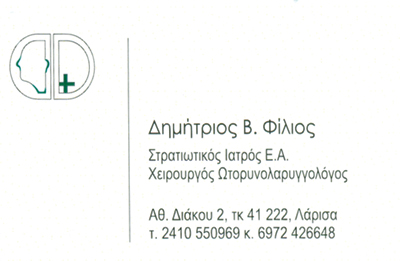Στρατιωτικός ΙατρόςΧειρουργός ΩτορινολαρυγγολόγοςΔιευθυντής ΩΡΛ ΚλινικήςΣτρατιωτικού Νοσοκομείου Λάρισαςτηλ. Νοσοκομείου 2410993664Πλήρης ακουολογικός έλεγχος, εμβοές, ίλιγγος, ροχαλητό.Ωράριο: 10:30 - 13:00 & 17:30 - 22:00 (Δευτέρα & Παρασκευή)10:30 - 17:30 (Τρίτη - Πέμπτη), 10:30 - 13:30 (Πέμπτη).