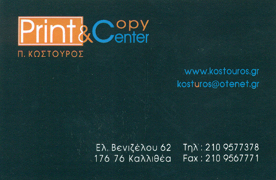 Ωράριο καταστήματοςΔευτ. - Παρ.: 8:30-18:00Σάββατο: 9:00-14:00Το 1993 ο Παναγιώτης Κωστούρος ξεκινάει την επιχείρηση "COPY CENTERΚΩΣΤΟΥΡΟΣ" με αντικείμενο εργασιών αποκλειστικά τις φωτοτυπικέςυπηρεσίες, σε ένα μικρό, αλλά ζεστό και φιλικό χώρο 20τ.μ. στην Καλλιθέα-Καλυψούς 111- κι έχοντας ως εφόδια την 8ετή πείρα του στο χώρο, τομεράκι και την όρεξη για σκληρή δουλειά.Αντιλαμβανόμενος άμεσα τις ανάγκες της συγκεκριμένης αγοράς, επενδύεισυνεχώς στην άριστη γνώση και χρήση της νέας τεχνολογίας κι επανδρώνεταιμε εξειδικευμένο προσωπικό.Το 1997 επεκτείνεται σε νέες εγκαταστάσεις 100τ.μ. -Ελ. Βενιζέλου 58-και δημιουργεί ένα σύγχρονο επιχειρηματικό περιβάλλον, όπου οργανώνεικαι αναπτύσσει περισσότερες και ποιοτικότερες υπηρεσίες και αναβαθμίζειτον εξοπλισμό, έτσι ώστε να ανταποκριθεί στις διαρκώς αυξανόμενεςανάγκες των καιρών και απαιτήσεις των πελατών, δίνοντας ολοκληρωμένεςλύσεις. Με ιδιαίτερο επαγγελματισμό, υπεύθυνη εργασία, επιμονή στην τελειότητα,συνέπεια στην παράδοση, φιλική διάθεση για συνεργασία καιανταγωνιστικές τιμές, θέτει τις βάσεις για μια μόνιμη σχέση εμπιστοσύνηςμε τους πελάτες-συνεργάτες, καθιερώνοντας το σύνθημα "δεν αντιγράφουμετην ποιότητα - δίνουμε ποιότητα στο αντίγραφο". Παράλληλα στρέφεται στονιδιαίτερα απαιτητικό και ταχέως αναπτυσσόμενο χώρο των γραφικών τεχνών,επενδύοντας σε εξειδικευμένο προσωπικό και αξιοποιώντας τις δυνατότητεςτης υψηλής τεχνολογίας.Το καλοκαίρι του 2004 η "COPY CENTER ΚΩΣΤΟΥΡΟΣ" μεταφέρεται σε νέοενιαίο χώρο 160τ.μ. -Ελ. Βενιζέλου 62- σε μια προσπάθεια να προσφέρειυψηλού επιπέδου υπηρεσίες σε ένα άνετο κι ευχάριστο περιβάλλον καιμετονομάζεται σε "PRINT & COPY CENTER". Μένοντας πιστοί στο τρίπτυχο "ποιότητα-ταχύτητα-τιμή"κι έχοντας πάντα σαν στόχο την καλύτερη και πληρέστερη εξυπηρέτηση τουπελάτη-συνεργάτη, συνεχίζουμε τις αναζητήσεις σε νέους χώρους παροχήςυπηρεσιών υψηλής τεχνολογίας.
