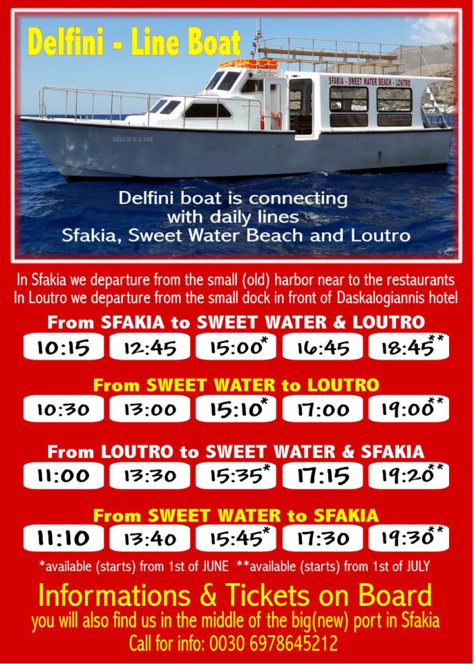 Θαλάσσιες μεταφορές και εκδρομές.Υπάρχουν καθημερινά δρομολόγια από και προς Σφακιά, Λουτρό, Αγία Ρούμελη, Φοίνικα, Μαρμαρά και Γλυκά Νερά.Μπορούμε επίσης να εξυπηρετήσουμε κόσμο και μετά το κλείσιμο της γραμμής.Δελφίνι: 30 άτομαΣφακιά Express: 30 άτομαΔελφίνι: 50 άτομαΛουτρό Express (Θαλάσσιο ταξί)Αναλαμβάνουμε συσκευασία συσκευών σε κοντέϊνερ, Αποστολή Πανελλαδικά.