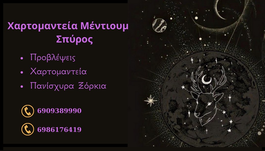 Ελάτε να δούμε μαζί τι σας απασχολεί, να αναλύσουμε το παρελθόν καθώς και να προβλέψουμε το μέλλον. Μέσω της χαρτομαντείας μπορούμε να πάρουμε απαντήσεις για όλα τα ζητήματα. Γιατί όταν ξέρεις τι πρόκειται να συμβεί μπορείς να προφυλαχτείς.Αναλαμβάνουμε πανίσχυρα ξόρκια που μπορούν να σας αλλάξουν την ζωή, φυλαχτά, λύσιμο μαγείας, ερωτικά δεσίματα και κάθε είδους προϊόντα αποκρυφισμού πάντα με πίστη στις πανάρχαιες παραδόσεις μαγείας απο κάθε πολιτισμό. Ένα μόνο να θυμάστε δεν θα σας ζητήσω ποτέ να το πιστέψετε το μόνο που θα ζητήσω είναι να το δείτε να συμβαίνει.Δυνατότητα και τηλεφωνικών προβλέψεων.Χαρτομαντεία, μαγικά, μαγεία, ξόρκια, επαναφορά ερωτικά, επαγγελματικά, ενόραση,απλή τράπουλα, lenormand, λενορμαντ, άνοιγμα τύχης, ταρώ.