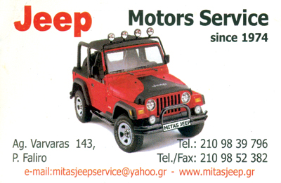 Η Εταιρεία MITAS JEEP SERVICE δραστηριοποιείται στο χώρο τουαυτοκινήτου από το 1974 καλύπτοντας όλους τους επιμέρους τομείς,με βασικό εργαλείο την άρτια και αποκλειστική τεχνογνωσία της ομάδας.Η MITAS JEEP SERVICE χρησιμοποιεί μηχανήματα τελευταίαςτεχνολογίας χειριζόμενα από το απόλυτα ειδικευμένο προσωπικό.Στρατηγική πολιτική της εταιρείας μας παραμένει πάντοτεη συνεχής αναβάθμιση και ο εκσυγχρονισμός των προσφερόμενων υπηρεσιώνμε σκοπό την άριστη εξυπηρέτηση των πελατών και την απόλυτη ικανοποίησή τους.Η Μυτας jeep service ανταποκρίνεται στις ανάγκες σας με επαγγελματισμό,καθώς και προσαρμόζεται στο budget σας, εφαρμόζοντας τις πιο εξελιγμένες τεχνολογίες.Εμπιστευθείτε την πολύχρονη εμπειρία μας για την επισκευήκαι τον εκσυγχρονισμό του οχήματος σας γρήγορα και οικονομικά.