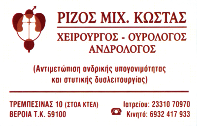 Λαπαροσκοπική ΟυρολογίαΘεραπεία Στυτικής Δυσλειτουργίας - ΥπογονιμότηταΔέχεται καθημερινά 09:00-12:00 και 18:00-20:00εκτός Τετάρτης απογεύματος.