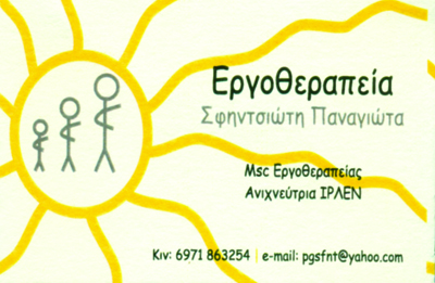 Σφηντσιώτη Παναγιώτα - Εργοθεραπεύτρια Mεταπτυχιακές σπουδές στην Αγγλία (Brunel University) στην επιστήμη της εργοθεραπείας.Αποφοίτησε το 2005 απο το ΤΕΙ Αθηνών τμήμα ΕργοθεραπείαςΕιδικευμένη στον Παιδιατρικό τομέα εργάζεται με παιδιά διαφόρων ηλικιών απο 1 1/2 ετώνμε διάφορες αναπτυξιακές και μαθησιακές διαταραχές.Μέθοδοι που χρησιμοποιούνται: Αισθητηριακή ολοκλήρωση, TEACCH, MAKATON, IRLEN, INPP σχολικό πρόγραμμα.Συνεργασία με άλλες ειδικότητες στο κέντρο της Λογοθεραπευτές, Ειδική Παιδαγωγό και Σύμβουλο Ψυχικής Υγείας.Συνεργασία με εξωτερικούς συνεργάτες: οπτομέτρη, φυσικοθεραπεύτρια.Συνεργασία με όλα τα ταμεία.
