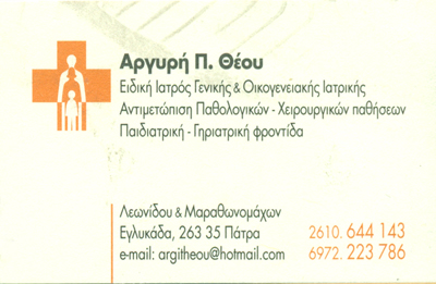 Γενικός Οικογενειακός ΙατρόςΩράριο:Τρίτη, Τετάρτη, Πέμπτη & Παρασκευή 08:30 - 13:00Δευτέρα & Πέμπτη 17:30 - 20:30