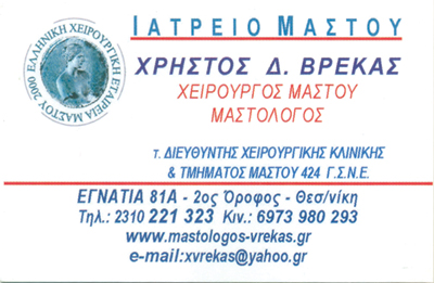 Χειρουργός μαστού, μαστολόγος, πρόληψη, διάγνωση, θεραπεία,συντηρητική, χειρουργική των παθήσεων του μαστού.Ογκεκτομή, τμηματεκτομή, hook τμηματεκτομή, απλή μαστεκτομή,ριζική τροποποιημένη μαστεκτομή, ογκοπλαστικές μαστού,ανίχνευση και αφαίρεση φρουρού λεμφαδένα.Όλες οι θεραπευτικές πράξεις γίνονται σύμφωνα με τιςκατευθηντήριες οδηγίες (esmo-nccn, up to date, medical professionals, guidelines).Ευρωπαϊκή πιστοποίηση στην χειρουργική μαστού από το european board of surgery qualification.Ωράριο:Δευτέρα - Παρασκευή 10:00 - 14:00 & 18:00 - 22:00εκτός Τρίτης & Πέμπτης απογεύματος